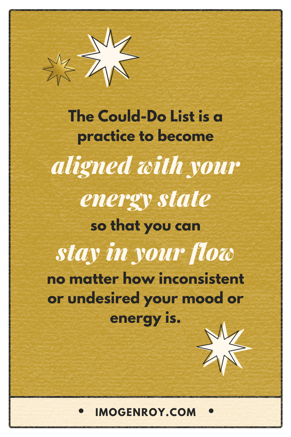 The Could-Do list is designed to work less like a list and more like a menu of options so that you can match your next task or activity to the mood or energy state that you're currently in. It's a tool to help you to check in with your body and to flow with the energy that you have at the moment. It’s a practice to become aligned with your energy state so that you can stay in your flow no matter how inconsistent or undesired your mood or energy is.